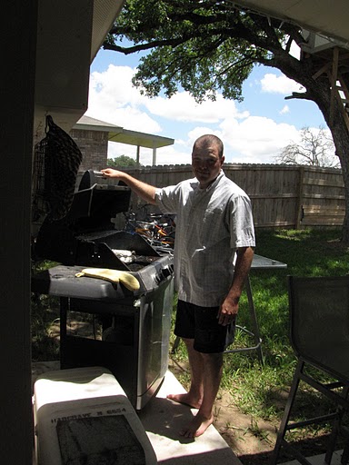 Matt and the meat. He had chicken, ribs, a steak for Nathan (it was his birthday present from us to him), jalapeno poppers, and corn on the cob all going at the same time on this thing. Matt is fabulous! And he did it all in some very attractive shorts. Oww, Oww!