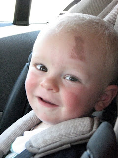 August 27th: I weed the front flower garden as Bennett plays on the trailer we had parked in our driveway. Suddenly, I heard a series of loud falling/skin-on-concrete sounds, and looked up in time to see Bennett skipping across our driveway on his forehead, much as you would see a flat rock skipping across a large lake. The result...